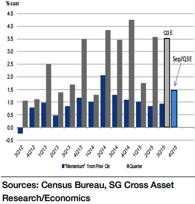 "The forecast, if accurate, would place real PCE in September 1.5% annualized above the projected Q3 average, implying that inflation-adjusted spending entered the final quarter of 2015 with a considerable amount of statistical momentum", added Societe Generale.