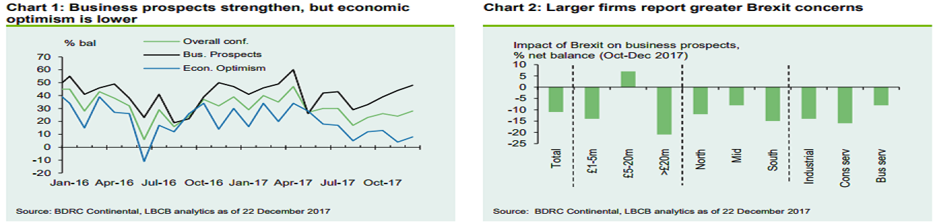 Overall business confidence rose by 4 points in December to a 5-month high of 28 percent. The increase this month reflected rises in both business prospects and economic optimism. The net balance of firms expecting stronger business prospects increased for a fourth consecutive month, by 4 points to 48 percent, the highest level since April and above the long-term average of 44 percent.