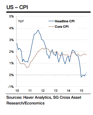 Food prices, which have been falling since January, are also likely to reverse and a 0.15% m/m gain is expected in this component of the CPI basket. Most importantly, core inflation is likely to return to a trend-like 0.2% m/m pace after a 0.1% print in May. The prior month's weakness was concentrated in used vehicle prices and in lodging, and this is not expected to be sustained. If the forecasts come to fruition, the yoy inflation rate will finally move to the positive territory for the first time since December. Core inflation should rise from 1.7% to 1.8%, meeting one of the Fed's criteria for a lift-off in rates.