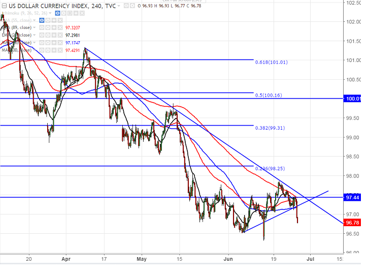 - On the lower side, major support is around 96.40 (61.8% fibo) and any break below will take the index down till 95.90/95.