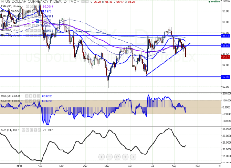 . - US Dollar index breaks major support 95 and declined till 94.76 at the time of writing.