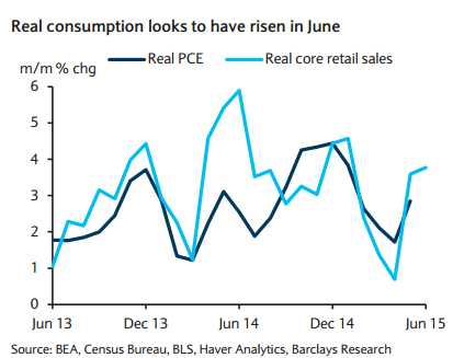 Retail sales were disappointing in June with core sales falling 0.1% m/m (forecast: +0.3%). The decline in core sales trimmed our estimate of real consumption two-tenths to 2.8%, bringing our GDP tracking estimate to 3.5%.