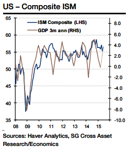 These factors have been weighing on manufacturing activity but should begin to dissipate in the coming months. Weak consumer demand was also a factor supressing demand for both goods and services in Q1, but this is now reversing. 56.9 forecast for the non-manufacturing ISM would put the composite of the two surveys at 56.5. This is consistent with GDP growth of 3.5%, close to 3.3% forecast for second quarter growth, says Societe Generale.