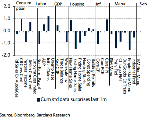 One bright spot was the fall in the U6 to 10.0% from 10.3%, which mainly reflected a reduction in the number of part-time workers.The normalized data surprises across sectors since the previous payroll report. Manufacturing has certainly been surprising to the downside, likely reflecting global developments.