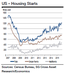 Single-family homes started is likely to increase by 15K units and to 755K, which will be the best performance since July, 2015, likewise, multifamily units started is expected to reach 465K, estimates Societe Generale.