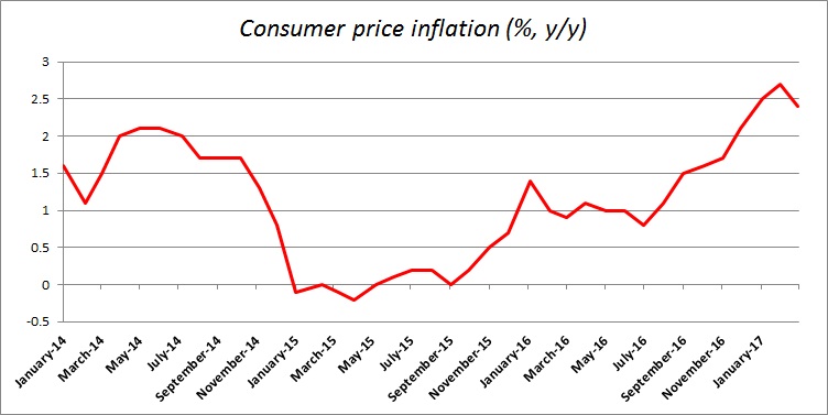 - Yearly CPI growth was +0.7 percent in December, the first sign of a comeback. In Mach 2016 it showed further signs of a bounce back, with 0.9 percent y/y. Consumer price index was up 1 percent in June 2016 and 0.8 percent in July on a yearly basis. In August it picked up further to 1.1 percent y/y. It rose again in September by 1.5 percent and by 1.6 percent in October. It rose further to 1.7 percent in November. 2016 ended with 2.1 percent y/y inflation. Headline consumer price growth reached 2.5 percent in January this year. Look at the above chart for greater clarity.