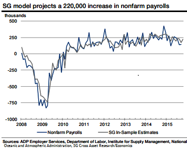 The BLS is expected to report that US payroll employment growth gathered steam once again in October, after disappointing results in August and September. Nonagricultural concerns hired 220,000 net new workers this month, besting the admittedly tepid 139,000 average gain over the August-September span.
