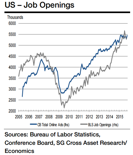 Echoing a decline in the Conference Board's online help-wanted advertising series, the Bureau of Labor Statistics' tally of available positions likely fell by 85K to 5.29 million in September, 380K off the record-high 5.67 million postings recorded in July.