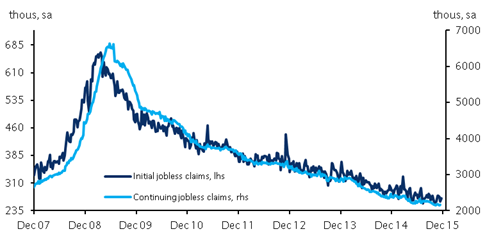 Continuing jobless claims for the week ending November 21 rose a bit to 2.161mn, though from a downwardly revised prior week reading of 2.155mn (initial: 2.207mn).