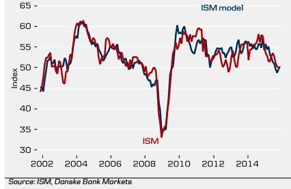 "The short-term ISM model and the 'new orders- customer inventories' differential both suggest an ISM around the 50 level in the coming month, but it is likely pastthe bottom. A turn in the global manufacturing cycle in the coming months would bolster the Fed's outlook for US growth above trend next year and we continue tobelieve that the first rate hike will come in January", added Danske Bank.