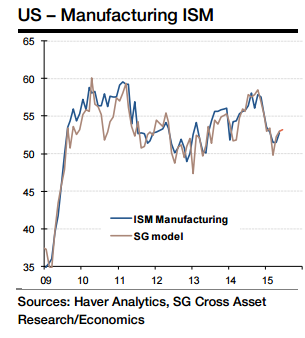 "Based on a historical correlation between the ISM and GDP, our 53.2 forecast for June would be in line with GDP growth of 2.8%. Incorporating the latest value for the nonmanufacturing ISM puts the compsite at 55.40, consistent with GDP growth of 3%",says Societe Generale.