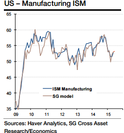 "Based on a historical correlation between the ISM and GDP, the 53.2 forecast for June would be in line with GDP growth of 2.8%. Incorporating the latest value for thenonmanufacturing ISM puts the compsite at 55.40, consistent with GDP growth of 3%", added Societe Generale.
