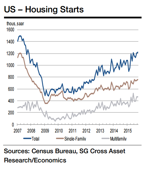 "Our projection would place October's housing starts level a whopping 21% annualized above the July-September average, after a comparative modest 2.0% Q3 gain", says Societe Generale.