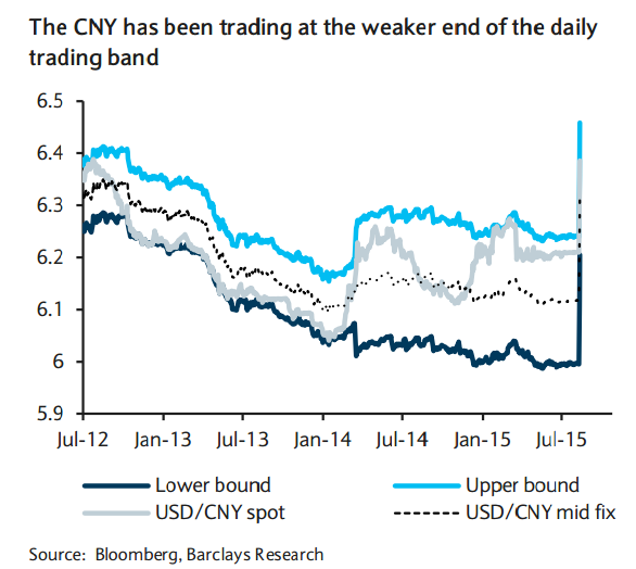 The announcement has already led to a 3% depreciation of the CNY against the USD, with the CNY weakening to as much as 6.45. The move had spillover effects across major global markets with core sovereign bond yields declining 10-15bp, S&P selling off 2%, and crude oil falling roughly 4% in response. Investors are largely viewing this move in the context of previous easing measures and as a signal that China's economy is probably weaker than previously thought. Falling commodity prices and the weakening CNY are bringing disinflationary concerns back to the fore. 5y5y inflation swap rates have been steadily declining across major markets and are not far from the lows.