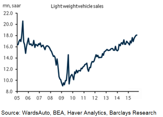 US auto sector has continued to outperform expectations over the past few quarters as consumer spending on durable goods has grown at a robust pace. The auto sales edged up 1.4% m/m to 7.76mn (saar) and light truck sales ticked down 0.5% m/m to 10.36mn (saar).