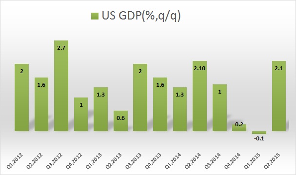 - US GDP picked up pace since 2013 and increased pace in 2014. However after rising 5% and 2.2% in previous two quarters, US GDP shrank by -0.1% in the first quarter of 2015. Historically speaking US economy usually falters in first quarter.