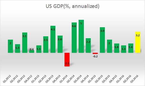 - According to the second flash estimate, GDP grew by 3.2 percent annualized rate in the third quarter.