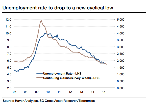 "Our wage growth forecast is for a moderate 0.2% m/m gain, a little worse than March but in line with the average sequential gains over the past six months Importantly, this would push the year-on-year growth rate in average hourly earnings from 2.1% to 2.34%, the strongest pace since 2009", Says Societe Generale.