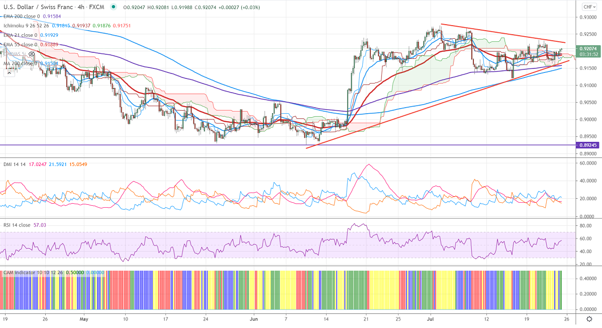 The pair is consolidating this month and struggling to break above 0.92748. USDCHF has taken support near 200-4H MA and trading inside a narrow wedge pattern. The overall trend is neutral as long as resistance 0.92750 intact. The weak US jobless data s preventing the par from further upside. The number of people who have filed for jobless benefits surged to 419k for the week ended July 16th compared to a forecast of 350K.USDCHFhits an intraday high of 0.92080 and currently trading around 0.92046.