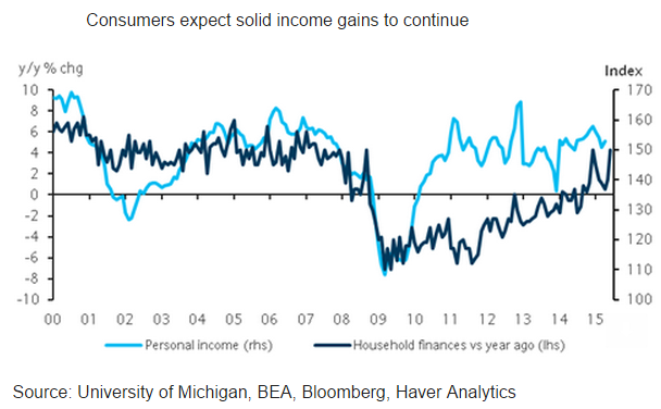 The details of this morning's release show that labor market strength continues to boost the outlook for the consumer; net income gains were reported for the fifteenth consecutive month, and households expect further gains of 2.2% over the next year. On balance, the stronger-than-expected print for consumer sentiment in early June supports our expectation of solid consumption growth over the next several months, adds Barclays