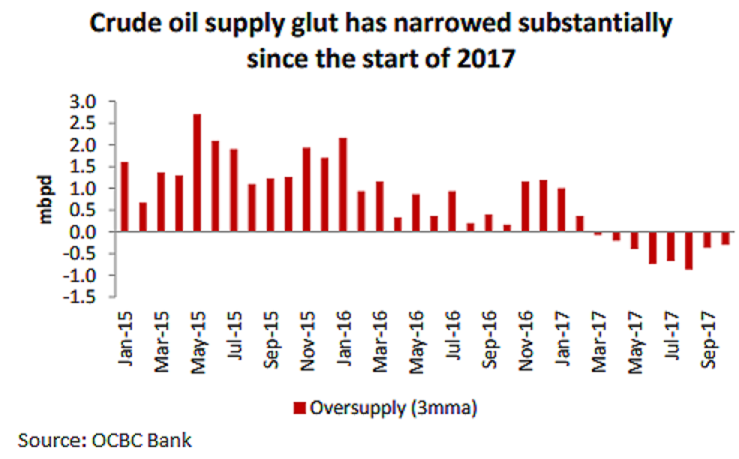 2017 has been an eventful year, especially for the energy complex. At the very least, crude oil prices have rallied from its low of the USD42/bbl handle in June to marginally exceed our year-end outlook of USD55/bbl. The uptick in oil prices is underpinned by the fruition of OPEC’s production cuts effort, recovering global growth and the consequent rebalancing fundamentals.