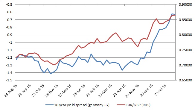 The yield spread (10-year german-10-year UK) has narrowed from -137 basis points in April to just -63 basis points as of now. Meanwhile, the Euro has gained from 0.77 against the pound in April to 0.865 as of now.