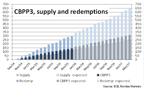 As the CBPP3 continues to gobble up bonds, this continues to leave a significant mark on the market. Liquidity has been reduced and spreads on covered bonds from the Euro area trade at tighter levels than peers. But with a current end-date of March 2017 the impact from the CBPP3 is very likely to fade, and this should increasingly leave bonds not included in the CBPP3 more attractive.