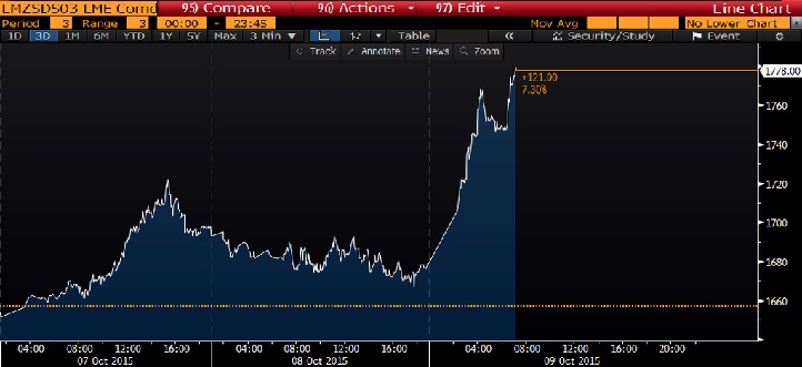 Zinc is giving its biggest one day rally in also 4 years, which as of latest data from London Metal Exchange (LME) is trading at 1778, up close to 7.5% so far today.