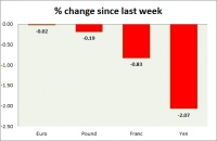 Dollar index trading at 99.4 (+0.24%) Strength meter (today so far) Euro -0.35%, Franc -0.48%, Yen -0.54%, GBP -0.15% Strength meter (since last week) Euro -0.02%, Franc -0.83%, Yen -2.07%, GBP -0.19% EUR/USD...