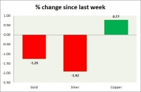 The metal pack is down today. Performance this week at a glance in chart table - Gold: Gold continuing its slide due to lack of demand over risk-on sentiment. Todays range $1252-1259 We expect the gold price to...