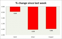 Metal pack is mixed today. Performance this week at a glance in chart table - Gold: Gold is down again as the dollar rises further. Todays range $1128-1140 Gold is currently trading at $1129/troy ounce....