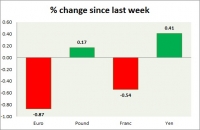 Dollar index trading at 98.65 (+0.33%) Strength meter (today so far) Euro -0.05%, Franc -0.27%, Yen +0.5%, GBP -0.5% Strength meter (since last week) Euro -0.87%, Franc -0.54%, Yen +0.41%, GBP +0.17% EUR/USD...