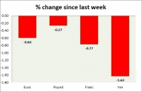 Dollar index trading at 96.16 (+0.20%) Strength meter (today so far) Euro -0.21%, Franc -0.26%, Yen -0.56%, GBP +0.02% Strength meter (since last week) Euro -0.60%, Franc -0.77%, Yen -1.63%, GBP -0.27% EUR/USD...