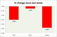 Metal pack is down today. Performance this week at a glance in chart table - Gold: Gold is down as rate hike as both equities and the dollar move higher. Todays range $1315-1325 We expect gold to reach...