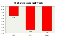 Metal pack is down today. Performance this week at a glance in chart table - Gold: Gold is down on stronger dollar. Todays range $1327-1321 We expect gold to reach $1520 Gold is currently trading at...