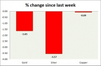 Metal pack is down today. Performance this week at a glance in chart table - Gold: Gold is sharply down today but likely to find support around $1300 area. Todays range $1313-1338 We expect gold to reach...