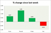 Dollar index trading at 94.17 (-0.34%) Strength meter (today so far) Euro +0.43%, Franc +0.32%, Yen -0.12%, GBP +0.72% Strength meter (since last week) Euro +0.67%, Franc +0.45%, Yen -0.51%, GBP +1.41% EUR/USD...