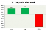 Metal pack is red today. Performance this week at a glance in chart table - Gold Gold is consolidating in its tight range above $1200. Todays range $1240-1222 Gold can drop towards $1130 area, if it...