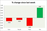 Dollar index trading at 97.45 (+0.25%) Strength meter (today so far) - Euro -0.25%, Franc -0.28%, Yen -0.14%, GBP +0.00% Strength meter (since last week) - Euro -0.26%, Franc -0.64%, Yen +0.81%, GBP -0.16% EUR/USD...
