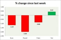 Dollar index trading at 97.42 (+0.05%). Strength meter (today so far) - Euro -0.28%, Franc +0.52%, Yen +0.78%, GBP -0.27% Strength meter (since last week) - Euro -1.19%, Franc -0.86%, Yen +0.42%, GBP -2.00% EUR/USD...