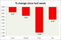 Dollar index trading at 99.23 (+0.22%). Strength meter (today so far) - Euro -0.15%, Franc -0.64%, Yen -0.30%, GBP -0.05% Strength meter (since last week) - Euro -0.33%, Franc -1.59%, Yen -0.78%, GBP -0.55% EUR/USD...
