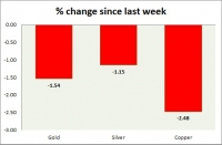 Metal pack is red today. Performance this week at a glance in chart table - Gold - Gold is down despite risk aversion due to stronger Dollar. Todays range $1100-1085 Gold is currently trading at $1087/troy ounce....