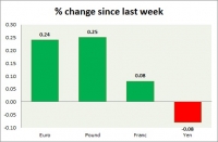 Dollar index trading at 99.89 (-0.30%). Strength meter (today so far) - Euro +0.38%, Franc -0.66%, Yen +0.01%, GBP +0.02% Strength meter (since last week) - Euro +0.24%, Franc +0.08%, Yen -0.08%, GBP...