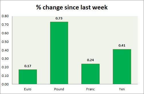 Strength meter (since last week) – Euro +0.17%, Franc +0.24%, Yen +0.41%, GBP +0.73%