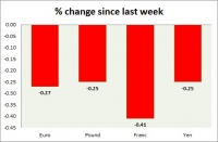 Dollar index trading at 97.19 (+0.29%). Strength meter (today so far) - Euro -0.42%, Franc -0.38%, Yen -0.10%, GBP -0.31% Strength meter (since last week) - Euro -0.27%, Franc -0.41%, Yen -0.25%, GBP -0.25% EUR/USD...