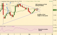 AUD/JPY rejected at session high by 78.55, trades around 78 handle. Pair struggles to break above 20-DMA at 78.42. Momentum studies are neutral. Upside finds stiff resistance at 78.55 (falling trendline). Break...