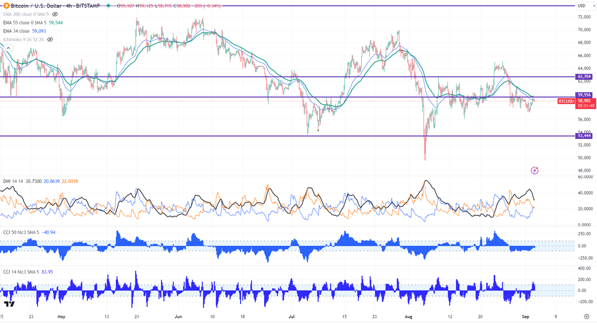 BTCUSD trades below the short-term moving average of 34- EMA and 55 EMA and the long-term moving average (200 EMA) in the 4-hour chart.