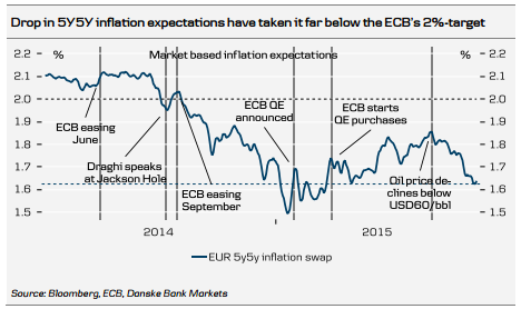 A year ago, when the 5Y5Y inflation swap dropped below 2.0%, Draghi drew market participants' attention to this medium-term inflation measure and made it clear that it is monitored at the ECB. The reversal of the slight upward trend following the announcement of its QE programme in January dissatisfies the ECB but the lower expectations are also related to the drop in the oil price and hawkish ECB members could argue that the inflation swap market is still suffering from a bit of poor summer liquidity, says Danske Bank in a research note.