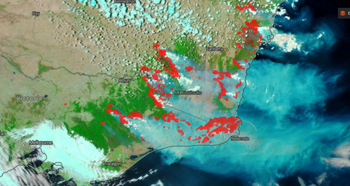 This is a true colour image of south-east Australia, taken on January 4th 2020 from the MODIS instrument on the Aqua satellite. Fire smoke is grey, clouds are white, forests are dark green, brown areas are dryland agricultural areas, and the ocean is blue. NASA Worldview / https://go.nasa.gov/307pDDX