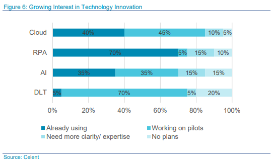 According to the report, while numerous DLT use cases are emerging in peripheral functions, the technology’s complexity makes it difficult for MIs to experiment with it individually. The survey results show that: